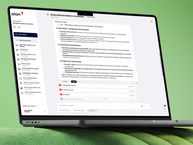 Modelltraining und Feintuning sind bei Alan entkoppelt von der Einbindung relevanter Dokumente. Das heißt: Alan berücksichtigt jederzeit bestehende Zugriffsrechte von geschützten Dokumenten. Eine zentrale Anforderung in vielen unserer Referenzen.